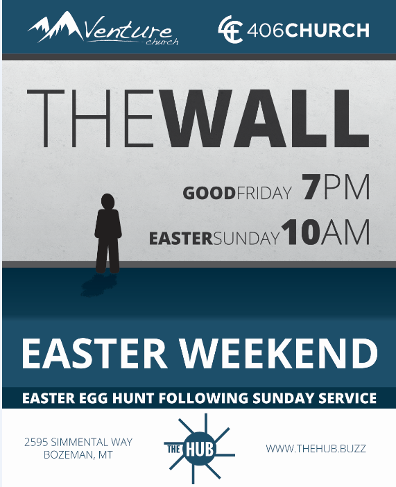 Events The Hub opens Easter Weekend. Good Friday Service, hosted by 406 Church, will begin at 7:00 pm. The presentation launching The Hub and the collaboration of two churches, 406 Church and Venture Church, will be Easter morning. Share this: Share on X (Opens in new window) X Share on Facebook (Opens in new window) Facebook Like Loading...